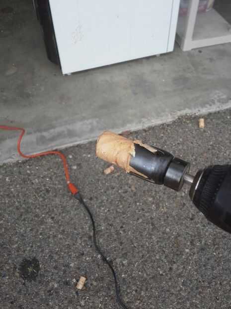 1. con el 1" Sierras de mi taladro, comencé el proceso de corte del agujero. Usé una sierra del agujero 1" porque 3/4" PVC tubería tiene un diámetro exterior más 1"(creo que su 1,050"). Esto hace que el agujero ligeramente más pequeño que el tubo que te encargaste de hacia el final.