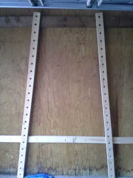 Una vez en sus soportes superiores e inferiores, es hora de poner el 2x4s Santo. Un amigo será útil para la celebración de 2x4s Santo en su lugar mientras ajusta y adjuntarlos. Fui con un marco de un enfoque así que puedo poner corta tableros encima de tableros superior y largos en la parte inferior. Tengo el 2x4s Santo va hasta el piso - me di cuenta de que debe tomar un poco de la tensión de las placas de soporte horizontal. Encontré algunos tornillos y clavos ahí el garaje que eran tiempo suficiente para profundizar en el soporte 2 x 4 así que me los Monte 2x4s Santo.