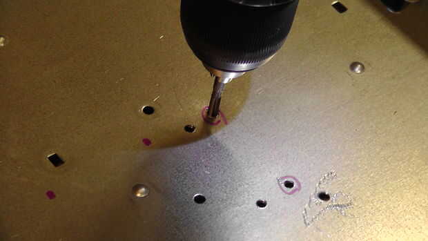 Una vez que ha presentado la colocación de las piezas, taladro y aprovechar los agujeros así que puede conectar las distintas partes. El amplificador que elegí tenía agujeros de montaje conveniente como el caso de la frambuesa Pi. Siempre asegúrese de limpiar y elimine las rebabas de los agujeros y asegurar que cualquier virutas de metal se quitan desde el interior de la caja.