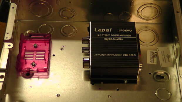 A pesar de que el gabinete parece amplio, asegúrese de que tener espacio para todo en allí y que allí no va a ser un problema de flujo de aire. Las piezas que terminó en mi gabinete incluyen el Raspberry Pi, un amplificador Lepai, un Rosewill 7-Puerto powered USB hub, una pequeña caja para las verrugas de conexión y pared de alimentación de 120 voltios para el amplificador y el hub USB. Usted rápidamente puede quedarse sin espacio, cuidadosamente considerar colocación y prueba, prueba!