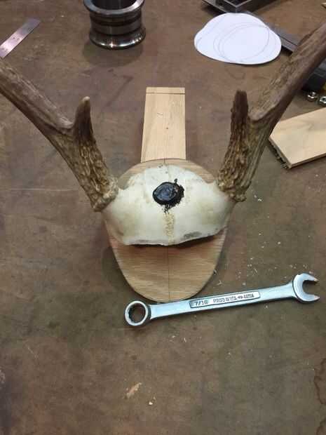 Así que primero, corté una pequeña placa de madera contrachapada de ¼" en forma de pera. Me áspero cortado con una sierra de calar y luego lijar a la línea que bosquejado en la Sierra de mesa con hoja de lija. Yo jugaba con el ángulo que quería los cuernos montados. Acabé de cortar un tornillo en 30 grados y soldado con autógena una arandela en la parte superior en el 30 grados. Este perno se desliza a través de un orificio que perforado en la parte superior del gorro. Tenemos un poco tig máquina hizo un trabajo rápido de la soldadura poco. Esto permitió que haya sólo una arandela fina encima de la placa de cráneo en lugar de la cabeza del perno más gruesa. También me ha permitido establecer el ángulo y al mismo tiempo tener la lavadora al ras contra el cráneo contra de tener un hueco en un lado o el otro. A continuación abofeteó algunos de este material llamado JB Weld alrededor de la arandela y la tuerca en el perno para asegurarse de que todo queda siempre apretado trabado para arriba. Hice lo mismo con el JB Weld en la parte inferior donde las tuercas sujetan la placa de montaje para el perno. La próxima vez lo haré probablemente utiliza pegamento gorila en vez del epoxi.
