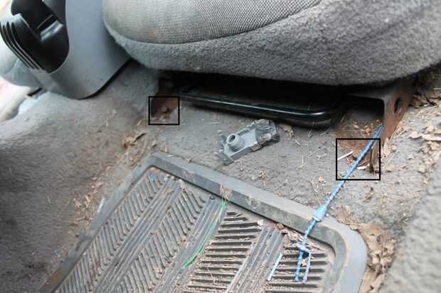 Después de que el aceite penetrante ha empapado en unos minutos, deslice el asiento del conductor completamente atrás y retire los pernos frontales con una toma de 13mm. Entonces puede deslizar el asiento hacia adelante para quitar la parte posterior los tornillos. Uno será de 13mm y el otro 18mm.