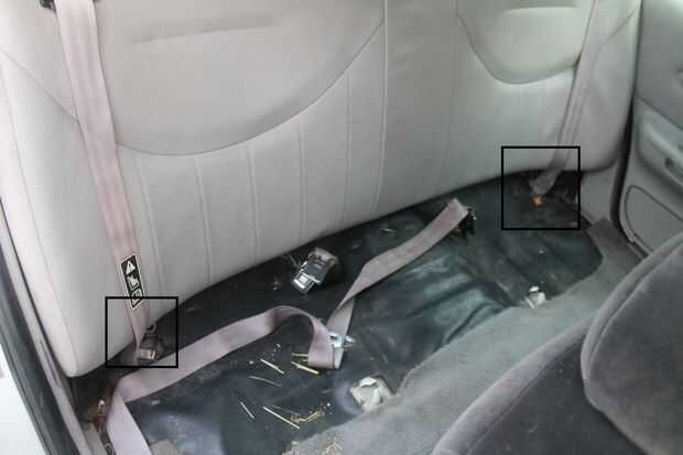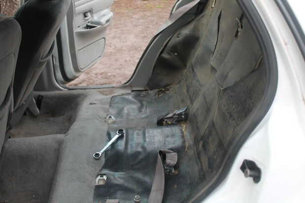 Este es realmente simple de hacer. Levante la parte inferior de los asientos traseros y a snap de su titular, luego retire las dos tuercas de 18 mm en ambos lados del respaldo del asiento. Son los mismos tornillos que el cinturón de seguridad. Después se quitan las tuercas, la sección trasera se desliza hacia arriba y puede eliminarse.