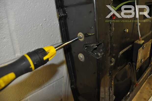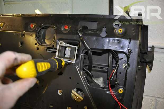 Comunicado cierre, retire los dos tornillos grandes en el borde de la puerta y 13mm el tornillo en la cara, este perno se es un espaciador entre el mecanismo de cierre y la piel de la puerta, tenga cuidado de mantener esto.