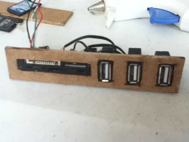 En primer lugar, se desmontará el Hub USB, usé una ranuras para tarjetas lector 3 USB Hub y separado la tarjeta ranuras ranuras USB de forma y decidir cuál será su posición final. Luego cortar en la madera las piezas para el nuevo cuadro de corte los orificios de la tarjeta y ranuras USB y pegar en sus respectivas posiciones.