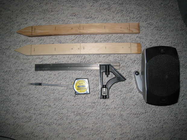 Utilicé una sierra de ingletes para cortar la madera porque me gusta un corte recto. Su puede usar cualquier Sierra que corta un pequeño trozo de madera. Mis destornilladores eran una Craftsman 41297 y un eléctrico Black & Decker uno. En caso de que usted no sabe lo que un cuadrado de prueba, es una herramienta que le dará un ángulo de 90 grados desde un borde. Es de líneas rectas y ayuda mucho con los cortes. Usé un lapicero y un sharpie, porque aunque el rotulador es más fácil ver y escribe mejor, la pluma tiene una línea más nítida. El vicio y la palanca barra son simplemente una manera para doblar una escuadra metálica. Si no tienes, imaginar otra manera.