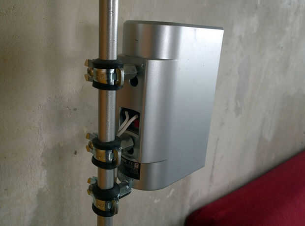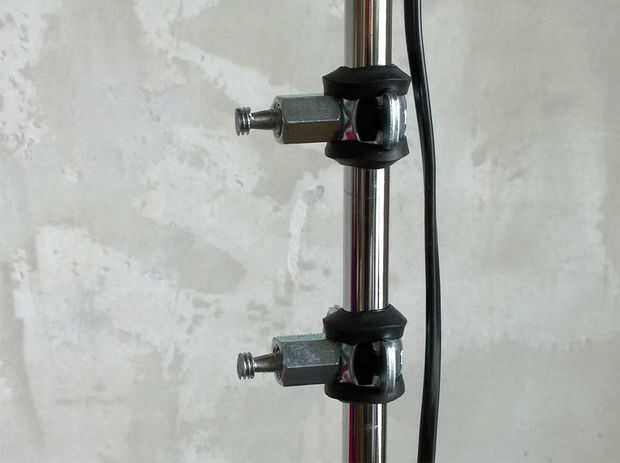 Trate de encontrar buena altura para su altavoz y coloque los sujetadores de tubo para el tubo de la lámpara. Con los pedazos de la varilla en su lugar, ajuste la distancia para los agujeros del altavoz. Peso del altavoz debe ser en ambos sujetadores. Decidí agregar un sujetador de tubo más bajo ambos altavoces para asegurarse de que no gire en sentidos no deseados.