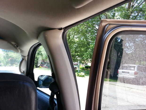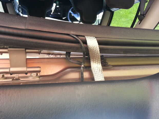 Ahora trabajar lentamente el cable coaxial detrás de los bordes de la carrocería interior. Donde no hay cuerpo plástico trabajo (por encima de la 3 º ventana lateral) puede empujarlo suavemente pasando el material del techo de felpa para continuar ocultando el cable. Al llegar a la puerta trasera, puede empujar el cable coaxial detrás el material gromet de goma encima de la puerta.