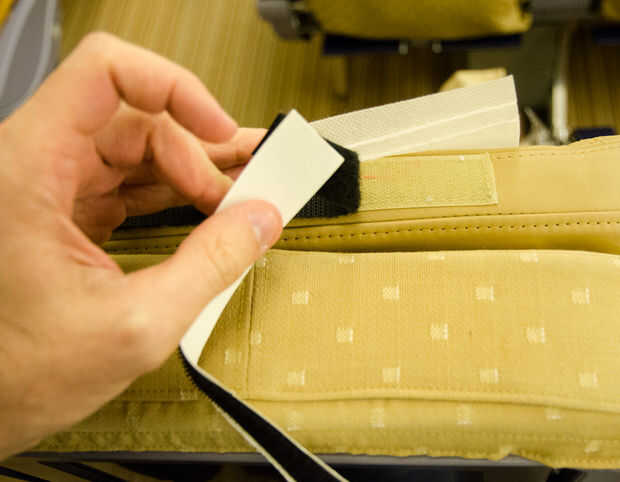2. Fije el soporte de la tablet al Velcro en la parte superior del asiento. El lado de ganchos del base de montaje debe apuntar hacia arriba. Las dos tiras verticales deben estar apuntando