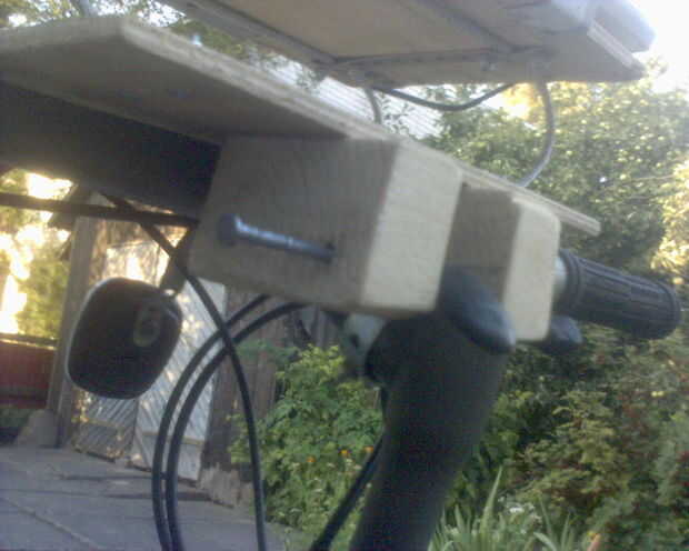 Inicialmente fue la única parte hasta que me di cuenta que se trata de un prohibido. Sólo era bueno para patín buenas maneras sin incluso badenes. Y no era mi intención. Primero trazó el contorno de mi eeepc en la madera contrachapada y aserrado, trabajó alrededor de los bordes con el archivo. No portátil, pero los bordes de la madera contrachapada. Esta parte puede ser un poco más pequeña que el portátil, ya que es difícil hacer tanto espacio en tu moto. Entonces yo trabaje con ella dos ladrillos de madera, tornillo bajo este estante de madera contrachapada en una manera de mantenerla en el remite ampliación tubería y no se mueven hacia los lados. Muchas bicicletas tiene un tubo que viene verticalmente y luego otra a ambos lados. Mi bicicleta tiene otro entre los dos, que se extiende el tubo horizontal más adelante. Básicamente este estante se basa en el tubo horizontal y no puede mover adelante porque los ladrillos apoyen el tubo horizontal, no puede moverse lateral causa que los ladrillos están en ambos lados de la tubería de extensión. Para no dejar que la plataforma baje, necesitará hacer un orificio horizontal a través de ambos ladrillos justo arriba del tubo de extensión. Este agujero tendrá el clavo largo cuando la construcción se montarán. Tenga en cuenta, que este agujero es el único medio de ajustar el ángulo de avance de la plataforma y más tarde la notebook para sentarse cómodamente a sus ojos. Eso depende de cuánto usted puede abrir su ordenador portátil. El primer eeepc abre como todo como unos 160 grados, que va a ser cómo van a quedar en el estante más alto. Otra cosa a la nota, la pantalla no es luz solar muy amistoso, pero una vez más, usted no verá en él todo el tiempo, sólo de vez en cuando.