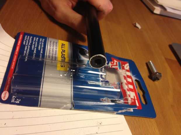 El inserto tiene un ajuste apretado (tuve que martillo en su lugar) y no creo que el pegamento era necesario en absoluto, pero lo tomé por si acaso. Otra opción sería tomar un martillo y un punzón para hacer un pequeño agujero en la pata de trípode, en el inserto.