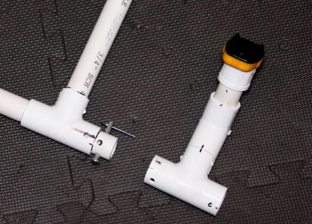 Una vez que han finalizado los ángulos perforación conector tee donde encajará el pasador de horquilla. Para diferentes ángulos, simplemente gire la espiga y a través del tubo interno pasando a través del orificio del vástago del taladro.
