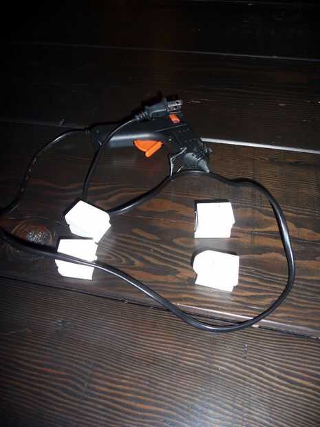 Primero 4 gomas de tamaño completo de la cinta y cortar cada uno por la mitad. Luego con cinta adhesiva. A continuación pegamento caliente los borradores a la parte inferior del helicóptero donde se puede
