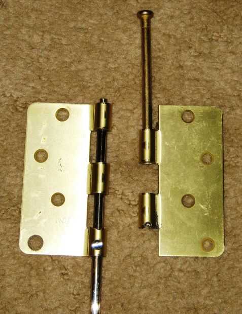 Solución: Así que decidí utilizar el método de fuerza bruta. Pongo la bisagra en un tornillo de banco. Tomé uno de los ejes de mi y comenzó a golpear con un martillo para ver si podía manejar los pines. Voila! Salió. Por supuesto el eje utilicé era demasiado grande para la apertura pero pude salir con un gran conjunto de pinzas. En retrospectiva, yo debo has utilizado un eje más pequeño o un golpe.