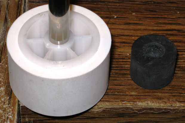 Solución: Así que robaban a través de mi partes otra vez y encontré esta poco goma rueda (supongo que para mover el papel). El agujero era demasiado pequeño para que se perforados a 7/64". Bueno, el plástico no tenía ninguna elasticidad así que tuve que conducir el eje en esta rueda. También encontré esta rueda de goma que estaba apretada en el eje. (ver fotos)