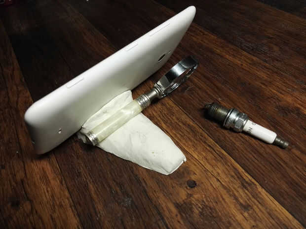 Si su presupuesto no se extiende hasta kits de lente estándar para el trabajo de macro de la cámara de teléfono, mirar alrededor para lupa de joyero usado en lugares como tiendas de caridad/segunda mano, coche arranque/garaje etc. ventas.Blu-Tack o e