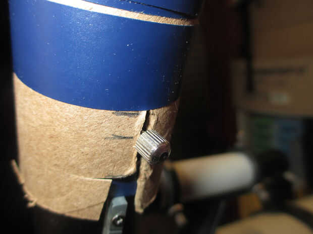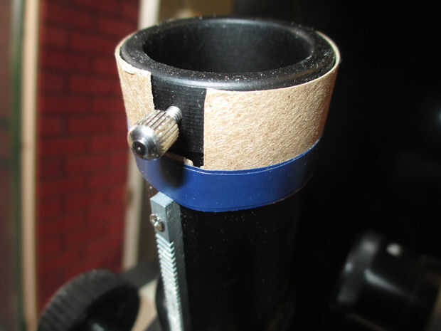 Para poder tomar fotos a través del ocular de la cámara debe ser celebrada por lo que su lente se encuentra en el ojo mientras mira por el telescopio. Me pareció la manera más fácil de hacer esto simplemente cortar un vertical de la raja en el tubo de cartón para el ocular tornillo que encaja y deslice el tubo sobre la montura del ocular. Una molestia que me topé fue que el tubo de cartón interfería con la rejilla para el mecanismo de enfoque, así que corte una ranura para ello.