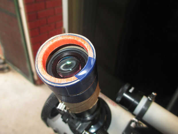 Usa más cinta aislante para fijar el cartón extra a la montura del ocular. Esto no debe interferir con el funcionamiento normal del telescopio, por lo que se puede dejar en forma permanente. El montaje de cartón se puede ahora simplemente deslizar y apagar según sea necesario. Tuve suerte de descubrir que si es necesario que todavía podía ver a través del ocular con el adaptador conectado.