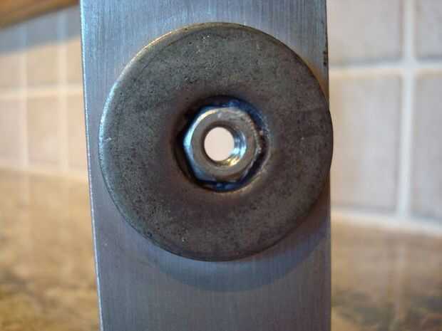 Que vaina mono orificio centrado y taladre el agujero lo suficientemente grande como para forzar la tuerca 1/4 en agujero y súper pegamento en su lugar. Super pegué las arandelas planas grandes a ambos lados para llegar al ras de la tuerca para el montaje.