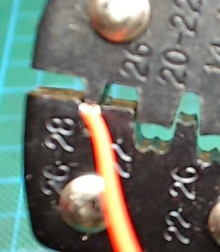 A continuación poner el conector en el yunque más pequeño siguiente (26-28) y le dan un ligero apretón. Hacer esto para asegurarse de que la presión es tan estrecha como puedo hacerlo. Tenga cuidado de no aplastar totalmente el conector, sólo desea un ligero apretón. Luego gire el conector de 90 grados y darle otro apretón ligero. Sinceramente, lo hago porque soy un poco obsesivo.
