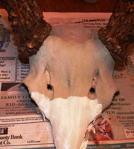 Podría blanquear el hueso sumergiéndolos en peróxido pero he encontrado ese brillo pintura de acrílico de la tienda hobby funciona mejor. Primero pinto el cráneo con un tono más oscuro neutro como "Natural", para cubrir las manchas que pueden sangrar a través de la pintura blanca.