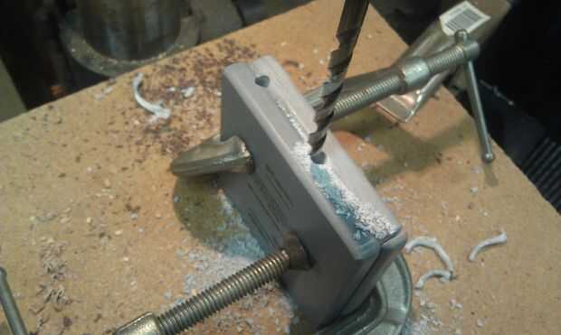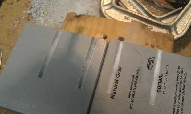 Si usa 1/2" superficie sólida, bien Fije las dos piezas juntas y perforar dos (1/4") en la articulación entre las dos hojas en el espacio apropiado. Yo no prestar especial atención a la alineación de las acciones de Corian contra el pedacito de taladro así que mis agujeros eran más profundos en una hoja que el otro.