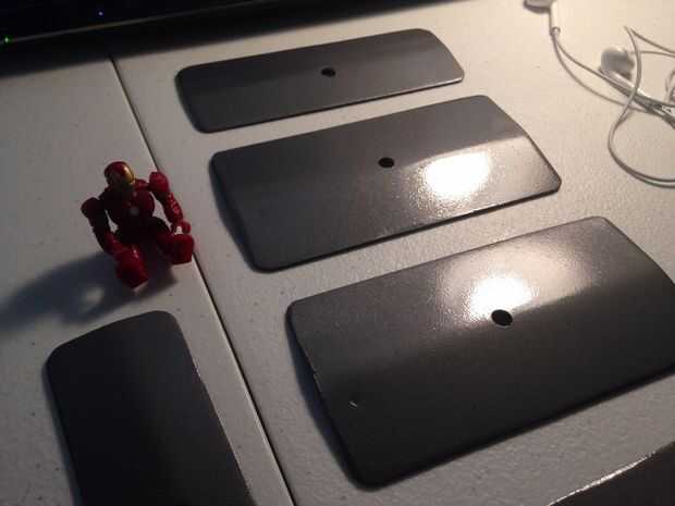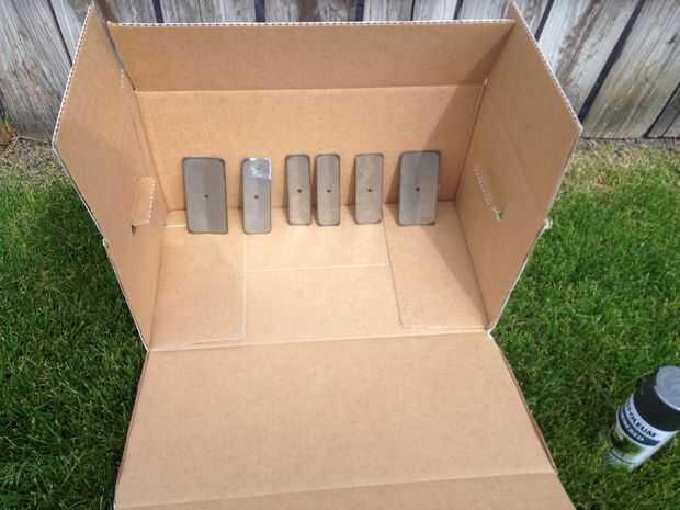 Me hice una pequeña cabina de pintura cortando una cara de una caja y lo establecen. Luego sostiene las piezas fabricadas en el último paso en la esquina y pintados a una cara. Dio los 30 minutos que se seque y luego les volteadas y pintar la otra cara. Me dio otros 30 minutos a secar luego trajeron al interior. Todavía eran un poco pegajoso así que les di durante la noche para secarse.