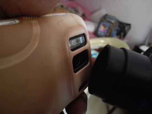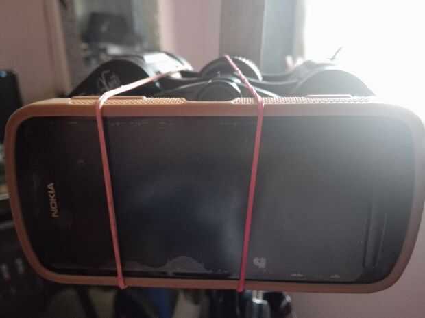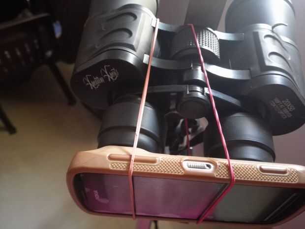 Fijar la cámara de los teléfonos en el ocular del binocular. Fix para vista constante agregando bandas de goma o abrazaderas de plástico.