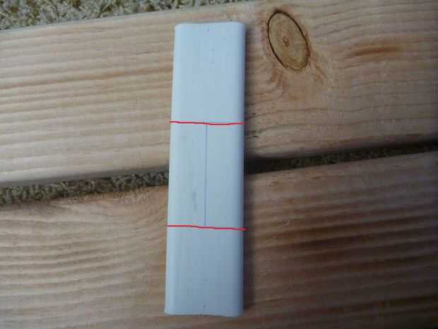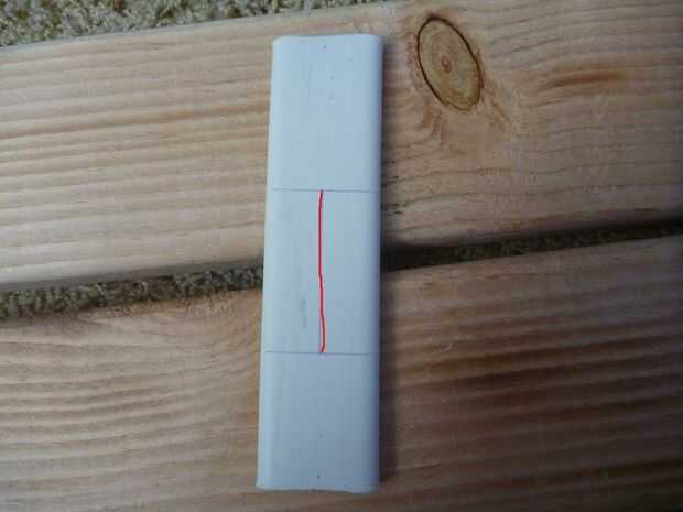 Otra vez con Serrucho de corte a lo largo de las líneas rojas medio camino a través a partir de los extremos. Quite los extremos del medio.