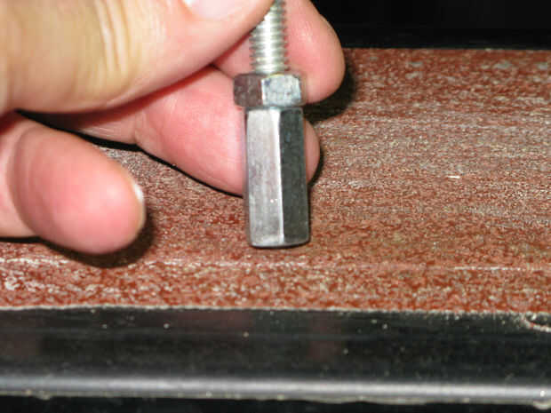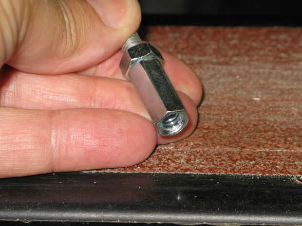 Abajo: Desde el 1/4" acoplador no es tiempo suficiente para ir a través de dos orificios en la pieza de abajo, tenemos a la pila de la tuerca de 1/4" y 1/4" acoplador debajo (que tiene un diámetro diferente) creando una zona roscada hasta la altura del material, como mencioné anteriormente, dejando suficiente espacio en la parte inferior de la pieza para una rosca de trípode. Así que perfore el orificio inferior 13/64" y la parte superior del agujero 13/32". Encastre el acoplador y la tuerca en los agujeros. Estos deben ser muy ceñido. (Comprobar el tamaño de su enganche y la tuerca y cambio el tamaño del taladro basado en las dimensiones). Asegúrese de que ejecutar el tornillo a través del acoplador y la tuerca mientras que insertar para mantener los hilos de rosca alineado.