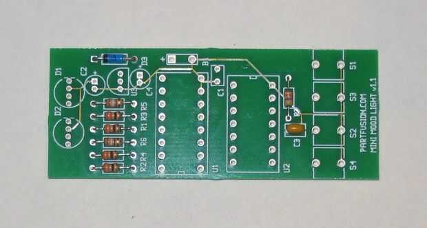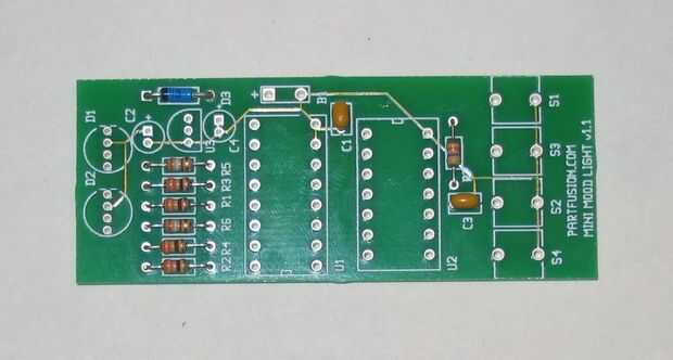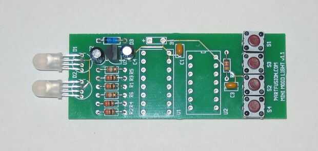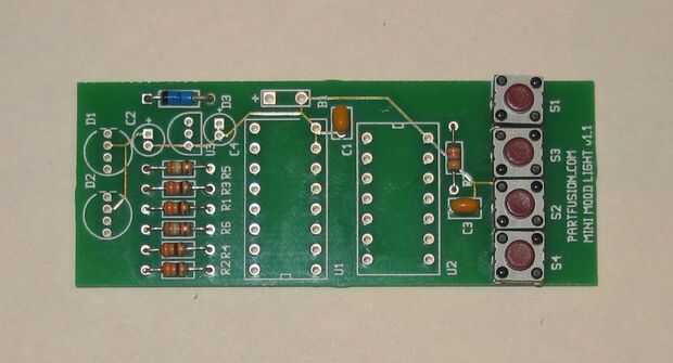 Los componentes siguientes son D1 y D2 los LEDs RGB. El LED tiene una parte plana que debe ser alineada con el lado plano del símbolo de la pantalla de seda. Los conductores del LED se pueden doblar también punto adelante si así lo desea.