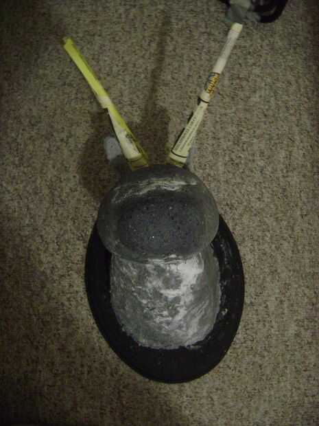 Romper la arcilla de secado al aire. Aplicar la arcilla a los cuernos. Usé un tenedor agregar agua para alisar hacia fuera los surcos.