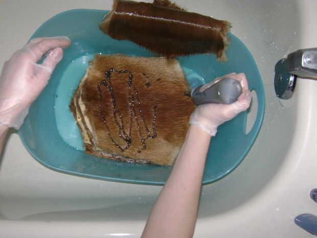 Había recuerdo oír en alguna parte que el Museo de la naturaleza había utilizado tinte cabello Nice ' n Easy para restaurar el caribú ensus dioramas después de que su piel había desvanecido de décadas bajo las luces de exhibición. Así que pensé que así podría probarlo en la piel que tenía.