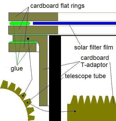 -Corte los componentes como en la imagen. No es necesario hacer los cortes triangulares para las aletas del anillo adaptador T, que se llevará a cabo el conjunto del filtro en el telescopio. Puede hacer cortes rectos a cada 1/2" o menos (estaba usando tijeras para eso y es más fácil cortarlas como en la foto).