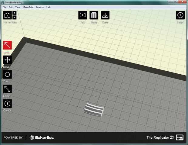 El archivo GlassHolder.stl contiene el modelo en 3D para imprimir. Si usas Makerware y una impresora 3D Makerbot, también he incluido el archivo GlassHolder.thing, pero no lo necesitas. Esta parte es pequeño y se imprimen fácilmente en una impresora de Makerbot 2 X. He usado una altura de capa de 0.10 m m, la máxima resolución de la impresora, que es probablemente una buena aproximación ya que las características son pequeñas. Imprimí con una balsa.