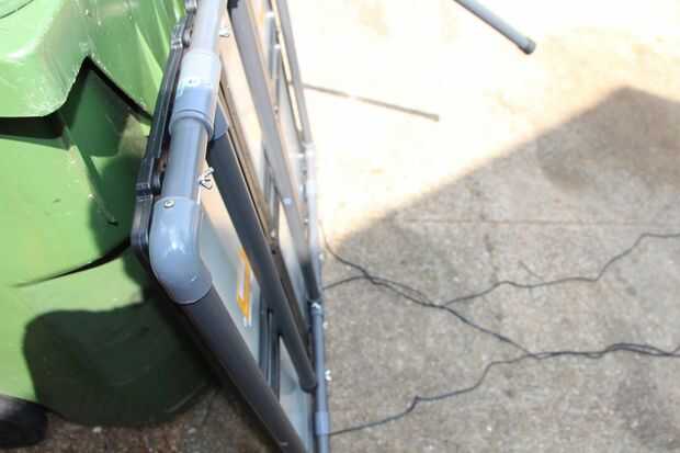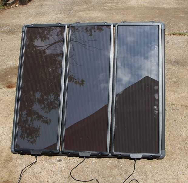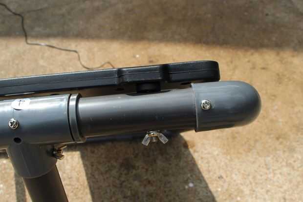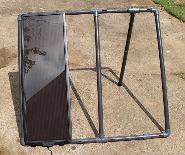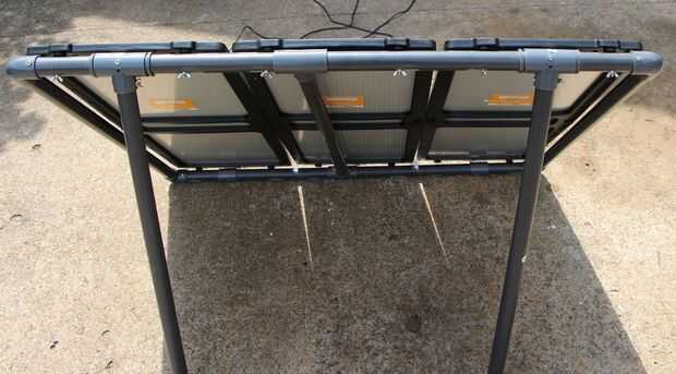El marco sí mismo tiene dos batiente piernas y ajustar su ángulo con dos de los tornillos de montaje. Esto facilita la configuración del panel, luego llevarlo hacia abajo cuando no esté en uso. Si te gusta acamparlo sería fácil guardar esto en alguna parte en tu Vanagon o camper luego arrástrelo hacia fuera y configurar en pocos minutos. Un destornillador philips (punta de Cruz) no lastimará si quieres todo apriete hacia abajo firmemente, pero no es absolutamente necesario.