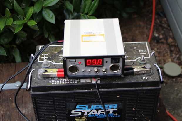 El último paso es conectar la batería. Fui por delante y conectado a una batería marina que tenía puesta alrededor y antes de el controlador desconectado el panel solar solo para ver lo que era la tensión. Es bastante bajo - 9,8 volts pero también es una batería muy descargada