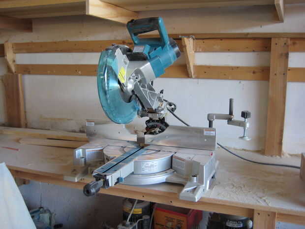 Mesa Sierra, ingleteadora, taladro de mano, cinta métrica.