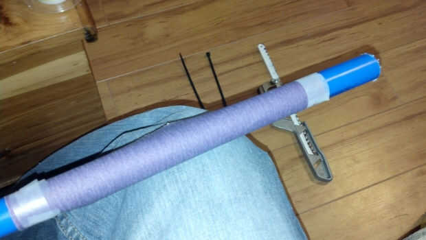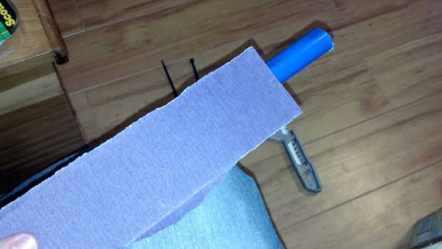 Usando el tubo sobrante y papel de lija crear un bloque de lijado redondeado. Las imágenes deberían explicarse... pero está fijar la lija a la tubería con la cinta.