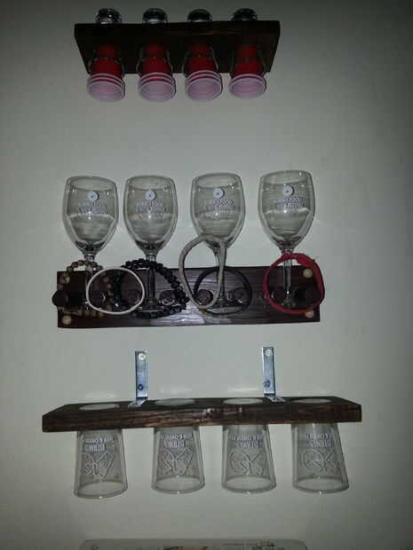 Tenía un conjunto de lentes que me dieron en una evento que me decidí a colgar en la pared de la cerveza. Tesis gafas molan bastante hay más pequeños y conseguir bebidas de mezcla pequeña. Hay un fresco coctel Copa pero puede también hacer esto completo vidrios de tamaño. Esto era bastante fácil de hacer que tenía restos de madera puesta en que solía hacerlo. Mancharon mina que es opcional pero hace mucho más agradable. Usé L soportes para fijar a la pared. La madera era cerca de 1 pulgada de espesor cerca de 15 pulgadas ancho por cerca de 4 pulgadas por lo que no necesita un gran trozo de madera para hacerlo. Se necesita un taladro más grande poco para hacer los cortes para los agujeros. Algunas herramientas necesarias pueden cortar la madera con una sierra de mano. Esto va con mi set de vaso de chupito y los titulares de pared de vidrio de vino.