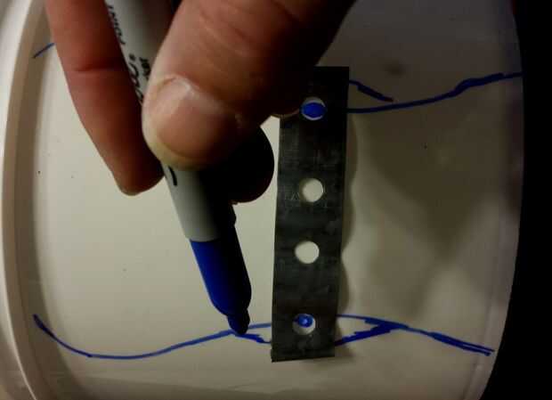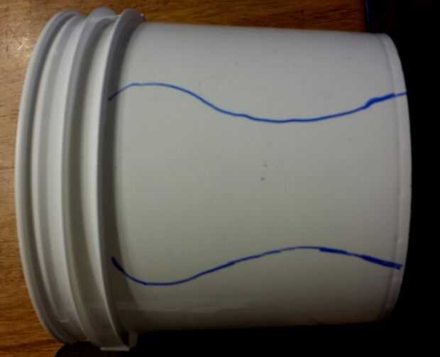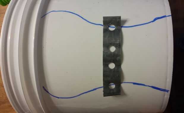 Yo desconcertado por un rato acerca de lo que sería el mejor refuerzo para la cámara. Me di cuenta que tenía un cubo de plástico de 1 galón sobre la misma curvatura que la espalda de un perro de tamaño mediano, como el schnauzer estándar de 35 libras para quien que estaba diseñando este montaje de cámara. Había trazado de la parte superior del arnés en el lado del cubo, luego agregó pedalier de cinta de plomero para modificar el contorno y marque los orificios.