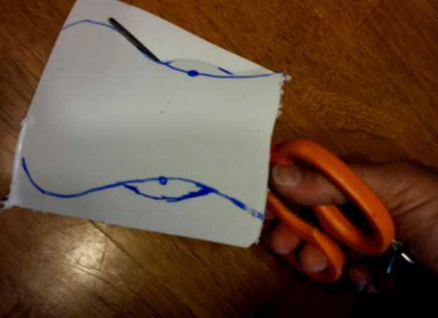 Corté el patrón, dejando un montón de material alrededor de él, con una sierra de calar. La corté en el contorno más precisamente con un par de tijeras. Una vez fuera de la cubeta, el material es relativamente flexible y fácil de cortar. En el lugar de perforación, yo salidos los agujeros con el exprimidor de mi navaja suiza.