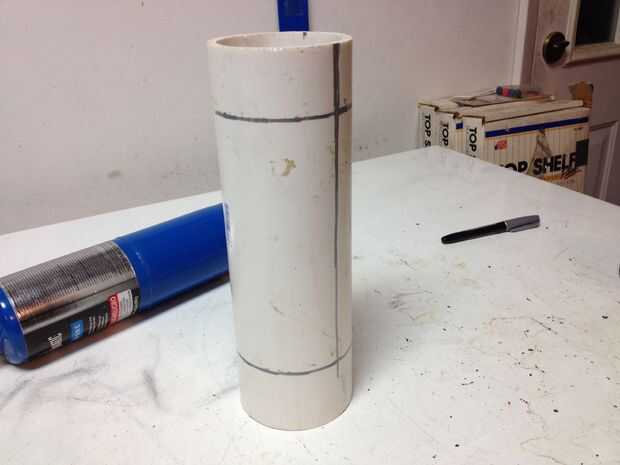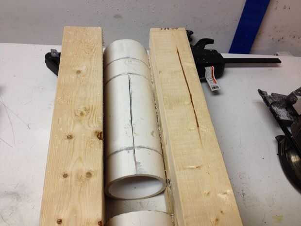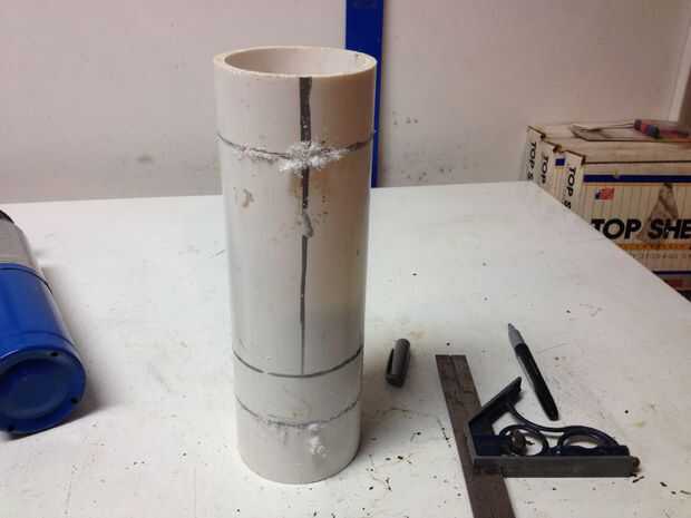 Use una sierra de calar para recortar la sección gris. La sección restante de la tubería por debajo de la plantilla puede cortar por el centro hasta topar con el anillo inferior. Luego corte el tubo hasta llegar a las marcas hechas en la plantilla.