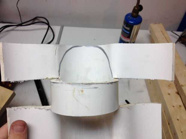 Traté de cortar la forma de la parte inferior antes de había doblado encima. Puedes ver que no tengo un fondo completo, ya que no permiten suficiente material. El siguiente proceso es cómo haría esto si tuviera que hacer otro de estos (no fotos). Utilice una pistola de calor, soplete o agua hirviendo para ablandar todo bajo el anillo inferior. Guantes para no quemarse. Una vez que el tubo es suave y agradable, aplanar hacia fuera y luego doblarlo en el anillo inferior. Puede que necesite Coloque la antorcha en este momento y aplicar presión hasta que el tubo se enfría y endurece. Hacer este proceso cerca de un fregadero para poder usar agua fría para acelerar el proceso de enfriamiento. Ahora debe tener un fondo formado. Corte cualquier exceso del PVC por lo que coincide con la curva del anillo inferior.