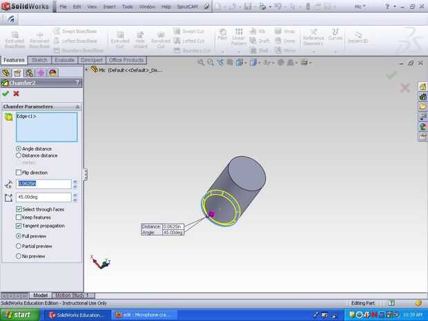 Ahora achaflanar el borde inferior con una distancia de 0,0625 '' y el ángulo de 45degrees