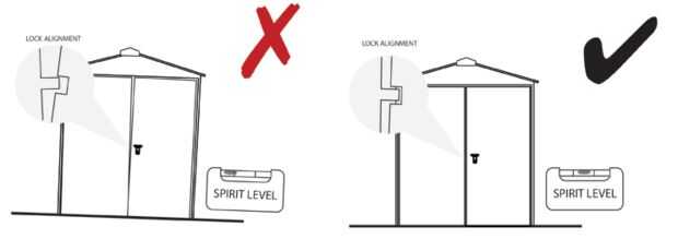 2. la base debe estar nivelada. Las razones principales de esto es porque Asgard productos están diseñados para estar segura como sea posible, las puertas necesitan a nivel de sitio en la tierra así que todos los tornillos y cerraduras pueden alinear correctamente. También necesita un firme nivel de base para quitar el peso de las vertientes, ya que vertientes de Asgard son pesados. Este galpón pesa unos 68 piedra.
