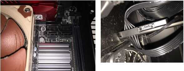 Ahora Conecte el almacenamiento de información a la placa base. Hay un más pequeña en forma de L cable de que encaje en la Ranura pasada del almacenamiento de información que coincida con un zócalo en la placa base. Las selecciones de zócalo se identifican con SATA 0, 1, 2, 3. Su selección depende en el manual del Motherboard, Tarjeta madre y la configuración deseada. El manual del Motherboard, Tarjeta madre tiene detalles en la configuración de SATA. Esta compilación va con SATA 0.