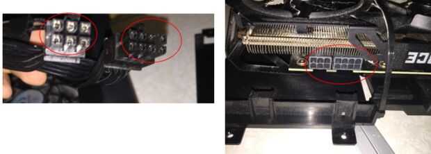 El último cable se convierte en un cable de 6 y 8 polos. Este se conecta en el enchufe correspondiente en la tarjeta gráfica. El cable se conecta a la fuente de alimentación a través de un zócalo azul.
