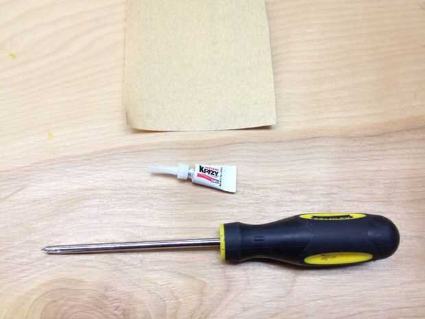 Pegamento , pegamento que funciona con madera. Pegamento de madera estándar funcionará, aunque "5 minutos" de epoxy probablemente ofrece el mejor equilibrio entre la fuerza de vinculación, tiempo de deshacer errores y tiempo de curado.