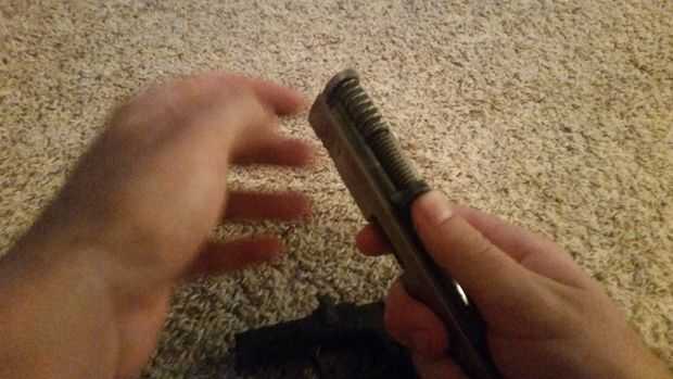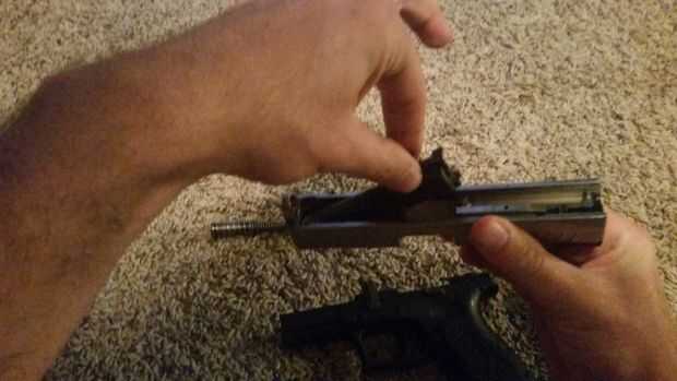 Poner la parte de desgaste de la primavera en primera y se conecta a la parte posterior del cañón. Entonces empuje el resorte para comprimirlo un poco deslizando el extremo delantero en el asiento para en la parte delantera de la diapositiva.